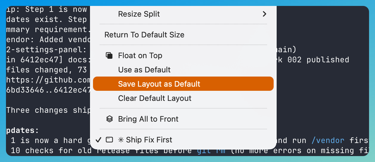 And… now it does. Or, I finally built it into my favorite Terminal with a “Save Layout as Default” which snapshots your current split tree so that the next time I launch — or click the dock icon — my layout returns.