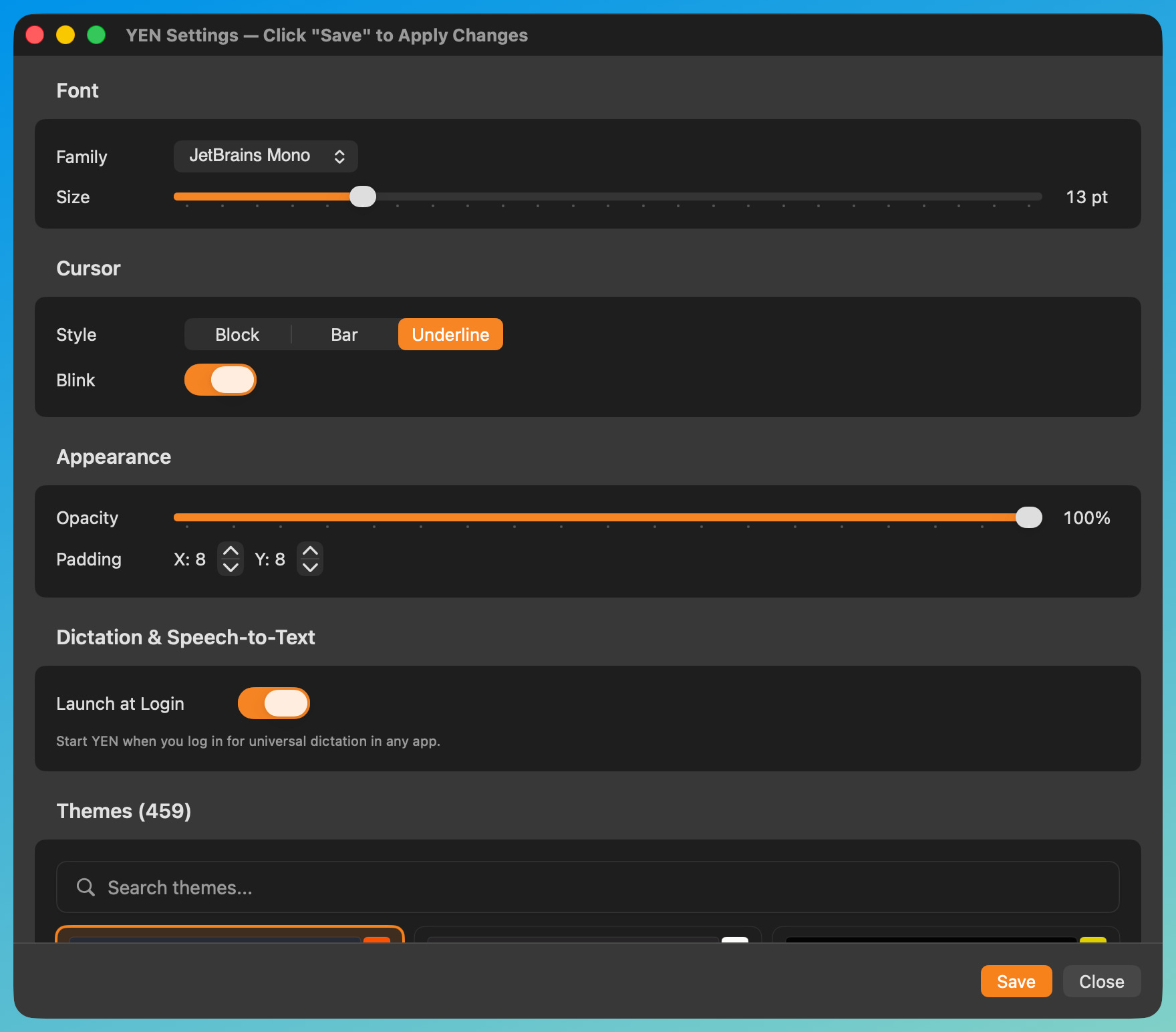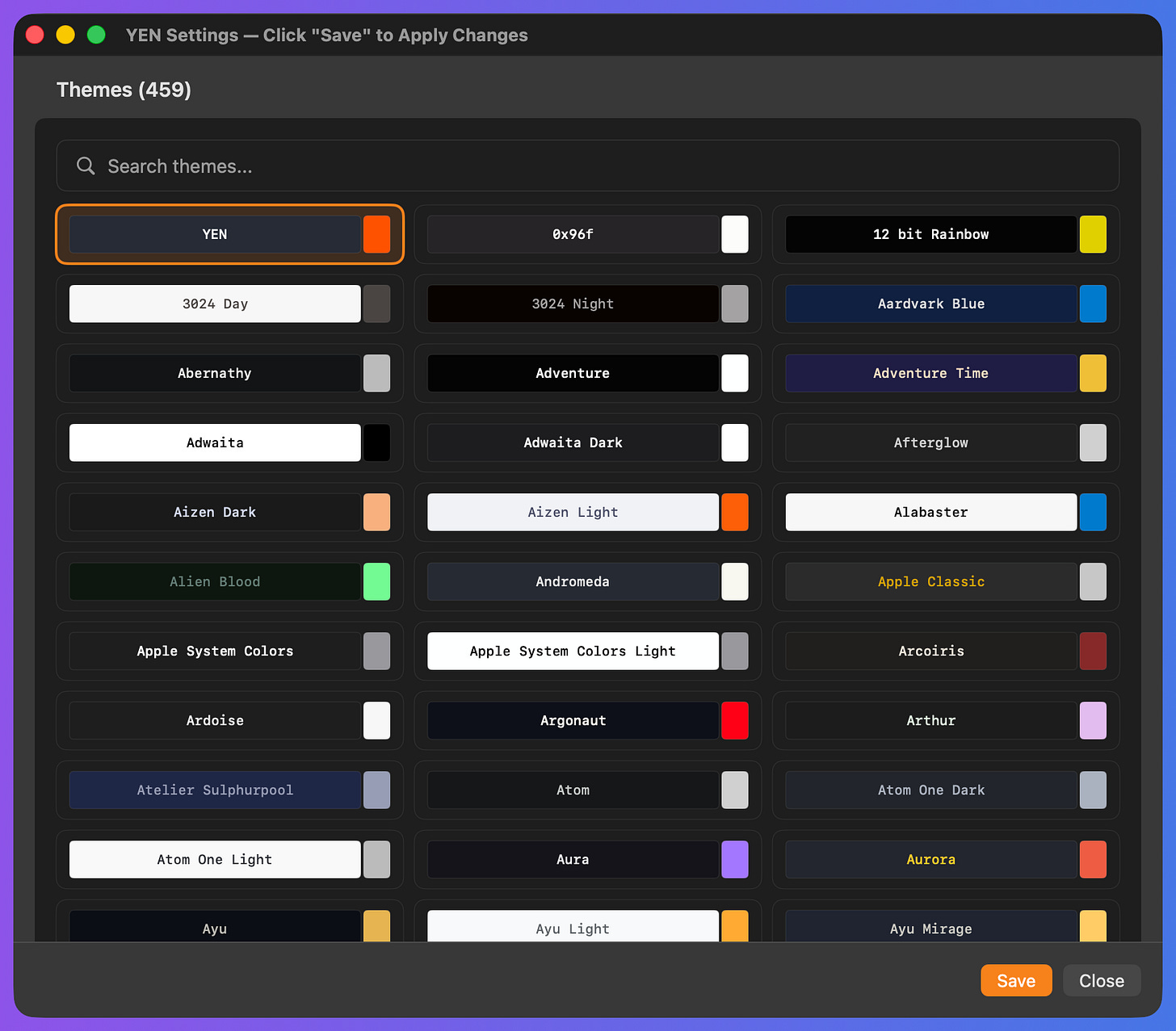 No color picker. No custom theme creator. No import/export. No cloud sync. If you want something custom, create a text file in ~/.yen/themes/ with your hex colors. That’s it. The settings panel will find it and show a preview.
