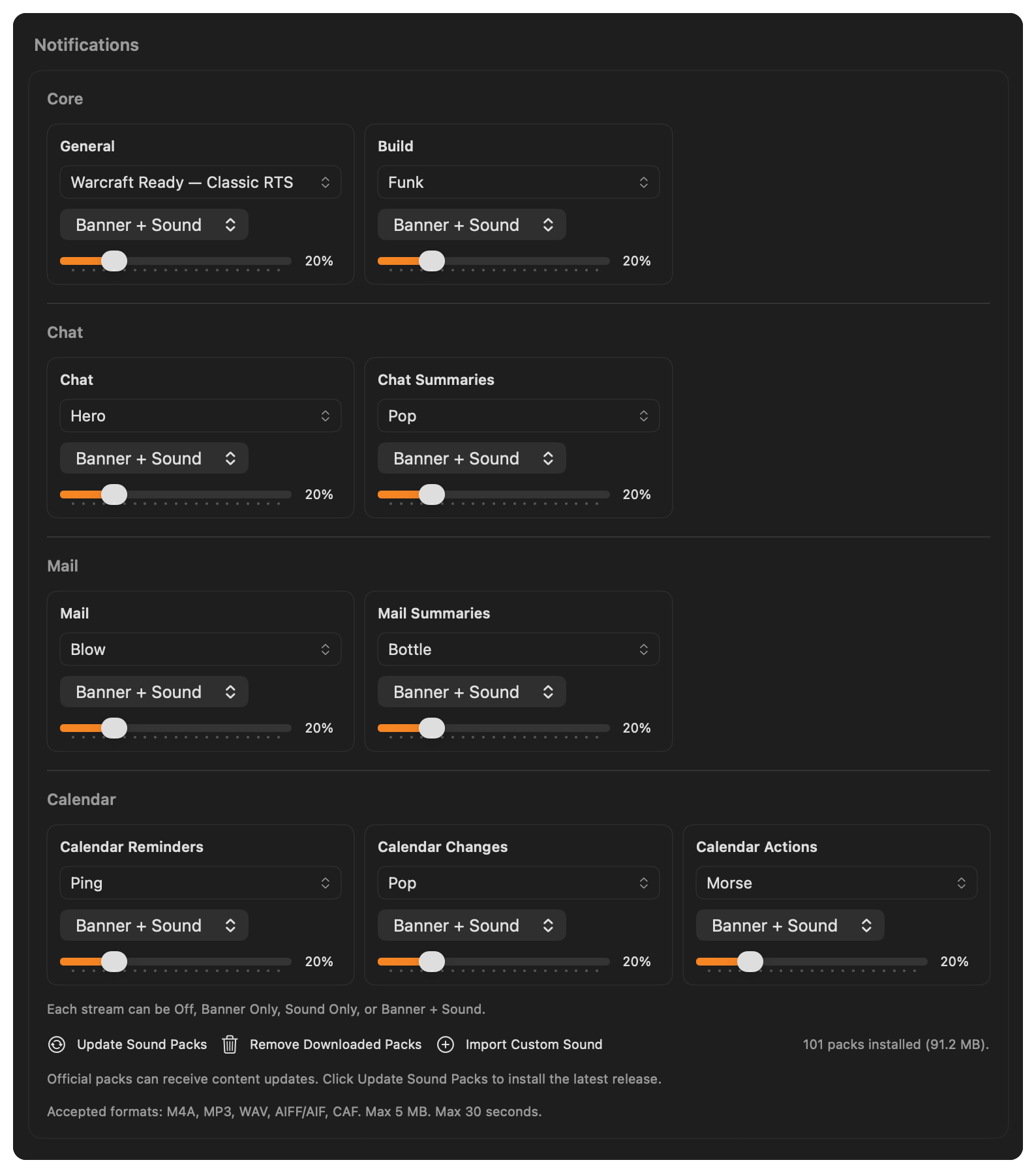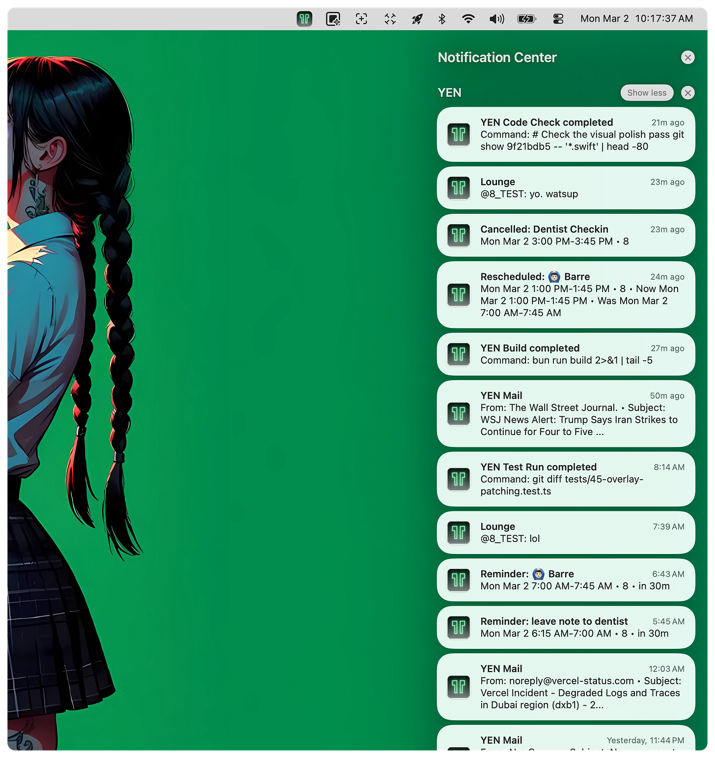 What you’ll see above are notifications spanning a number of different splits and views, like messages from our built-in chat and email and calendaring, or even a command that was just completed or updates from one of your cli dev tools. You get it all and can, of course, customize each type as you wish: