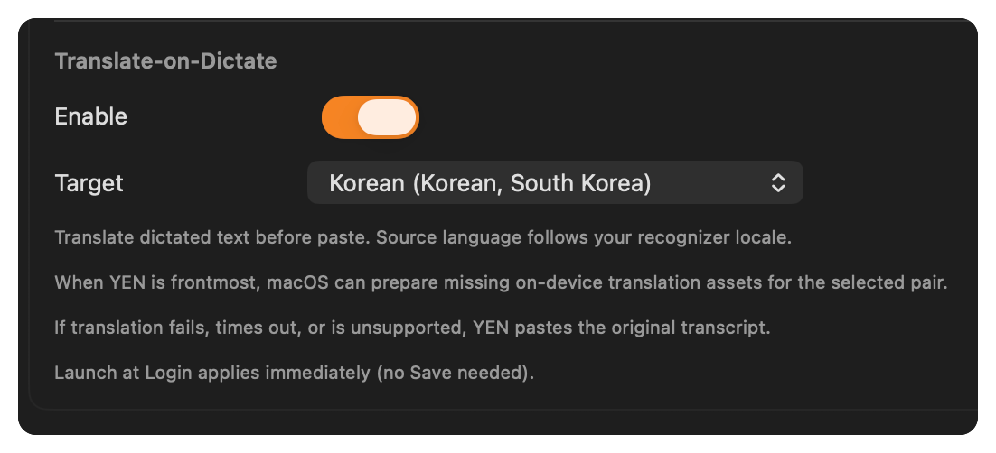 If macOS still needs translation assets for the selected pair, keep YEN frontmost in Settings for the preparation step. Once the pair is ready, dictation uses it. If it is not ready yet, paste still falls back to the original transcript.