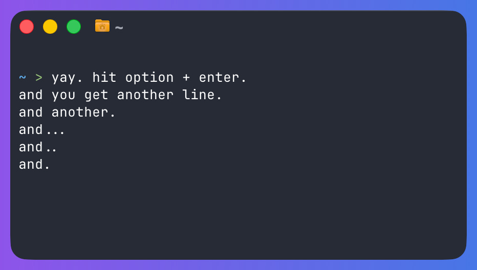 Press Option + Enter in your terminal. Go ahead, try it. If you are using most terminals, you get a normal newline. Your shell runs the command or drops to the next line. Life is good.