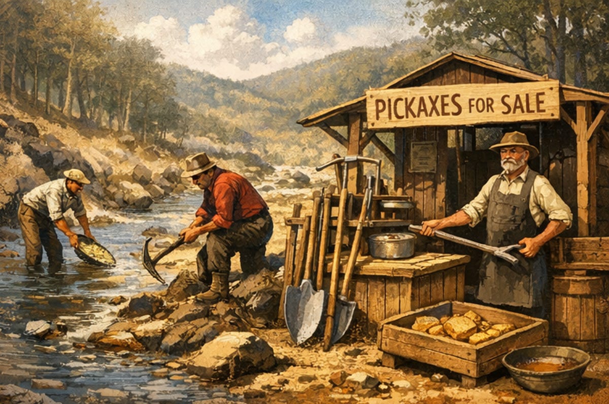 Chris Dixon wrote in 2011 that in a gold rush, you can mine for gold or sell pickaxes. Investopedia frames the same strategy more formally: Back the suppliers that power the ecosystem, not just the end product. Different phrasing, same lesson.