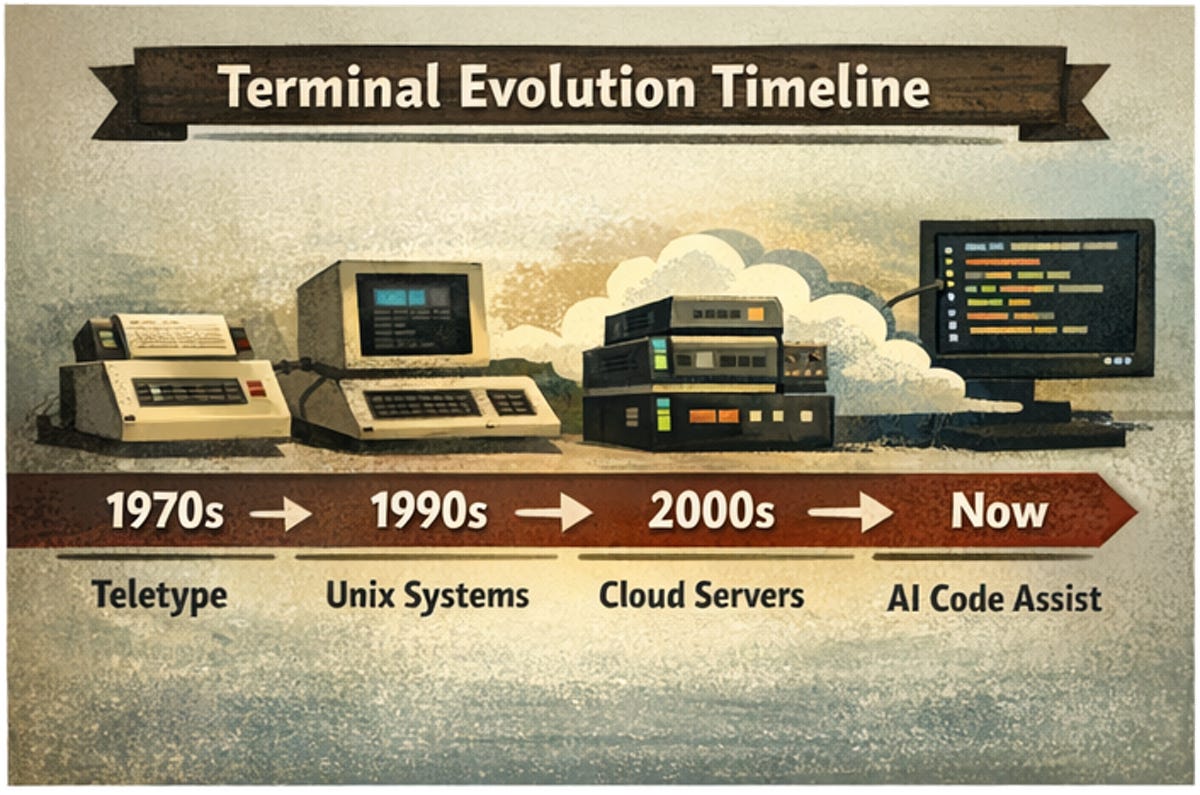 Before AI coding agents, before cloud IDEs, before Electron editors, the terminal was already the operator surface for software.