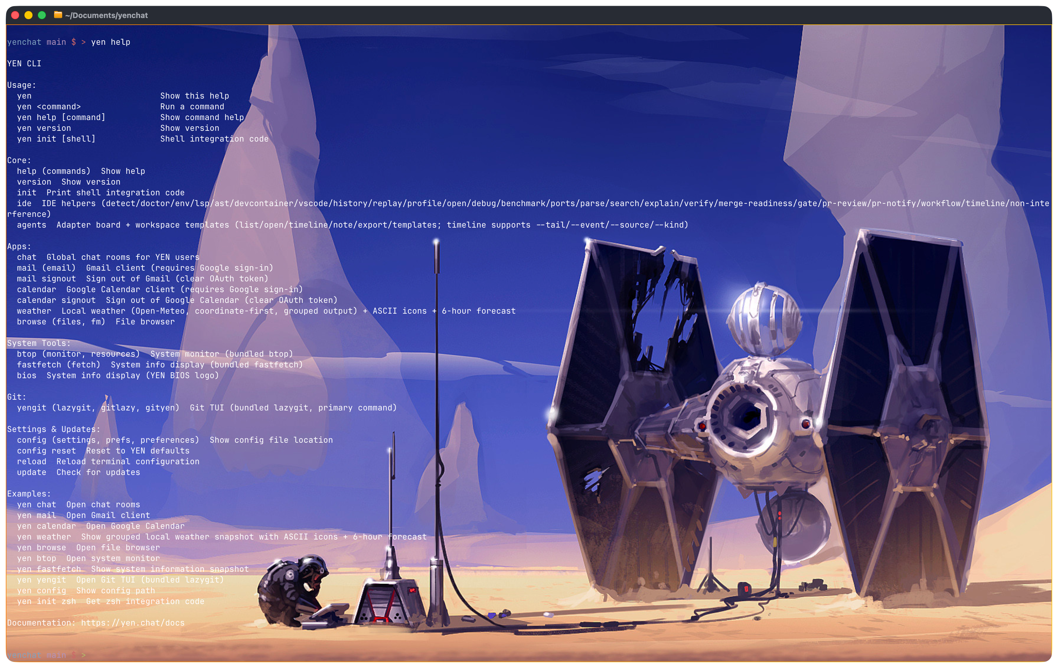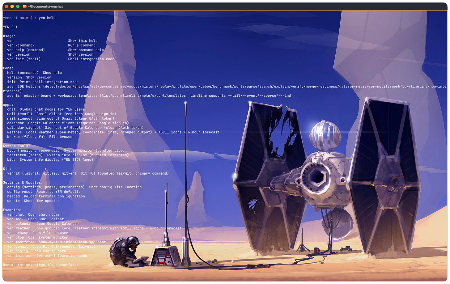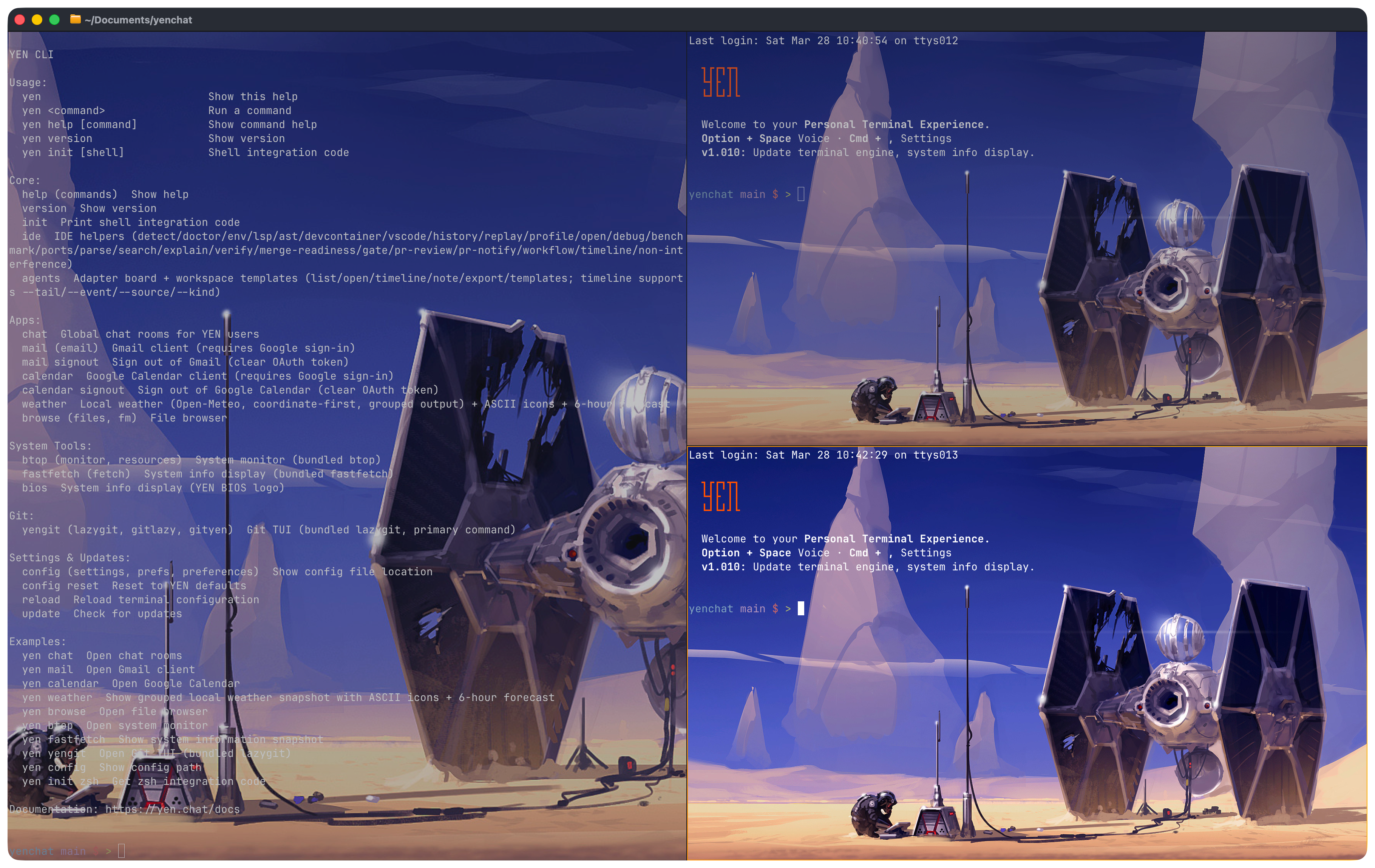 Global (all windows) — The image is a wallpaper. It’s yours, not the terminal’s. Wherever YEN renders, the image is there. Good for people who set one image and forget it.
