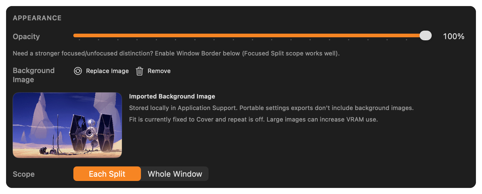 Per-tab — The image belongs to the current tab’s context. Switch tabs, different look. Split panes within a tab share the same image. This is the default because it maps cleanly to how most people think about “what I’m working on right now.”