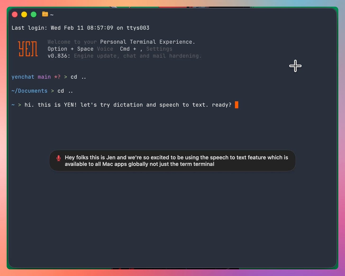 YEN has had speech-to-text since v0.58. Hold Option + Space, speak, release, text appears. It works. But there was always this moment of faith between speaking and releasing the key. You couldn’t see anything. Just a blinking dot in the menu bar.