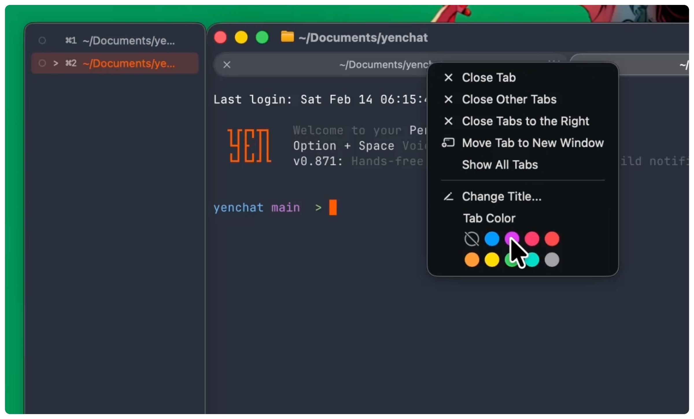 v0.841 shipped this week and it includes something I’ve wanted to build for a while — a tab sidebar for YEN! If you’ve ever had 6+ terminal tabs open and lost track of which one is running your dev server vs. your git log vs. that SSH session you forgot about — this one’s for you.
